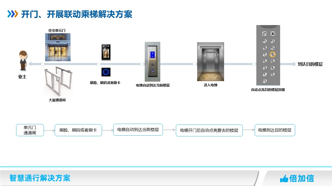 在住宅小區項目、寫字樓有通道閘項目,業主只需要在單元門或者通道閘上刷卡、刷臉、或者刷二維碼后,開門或者開閘后,同時系統自動呼叫電梯到當前樓層,電梯到達后,自動開門,乘梯人進入電梯不需要再刷卡/刷臉/刷碼,電梯自動點亮業主所住樓層按鍵。